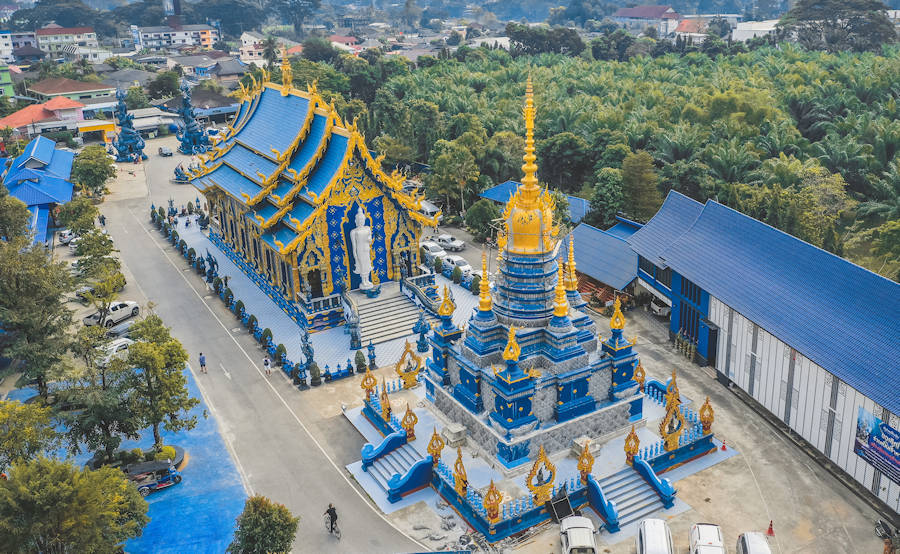 Wir erkunden auch den Wat Rong Suea Ten, der als Blauer Tempel bekannt ist. Dieses moderne buddhistische Heiligtum zeichnet sich durch ein lebhaftes Zusammenspiel von blauen und gelben Farbtönen aus, die das Gebäude schmücken.