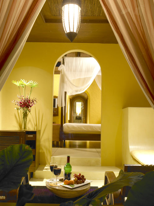 So wohnen Sie: Ihre private Villa betreten Sie durch ein Holzportal und kommen so auf die große Terrasse. Über 100 qm groß ist Ihr privates Reich für diesen Urlaub. Im Freien gibt es einen überdachten Pavillon mit Tisch und Stühlen sowie Liegestühle und Sonnenschirm. Das Innere der Villen ist sehr geschmackvoll gestaltet, warme Farben und Lichtelemente sind gut genutzt und schaffen eine sehr wohnliche Atmosphäre mit elegantem Touch. Über einen Vorraum kommt man in den Schlafraum und ins elegante Badezimmer. Für die Innenausstattung wurde u.a. Teakholz, Rattan und Seide verwendet.
