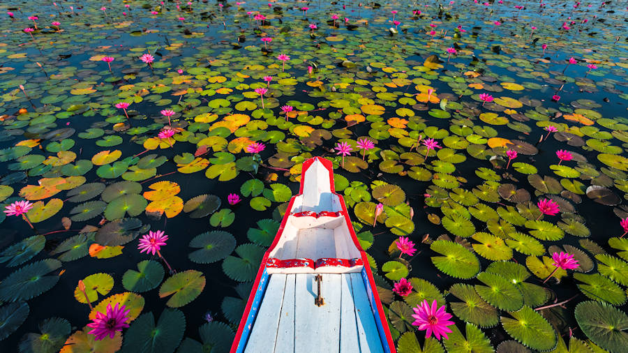 05:30 Uhr - Thale Noi Lotus See. Frühes Aufstehen ist hier Pflicht und wird mit wunderschönen Eindrücken belohnt. Denn Sie unternehmen eine Bootstour um den Sonnenaufgang über dem beeindruckenden Thale Noi Lotus See zu erleben. Thale Noi ist das größte Wasservogelreservat in Thailand und hier wachsen über 5 Millionen Lotusblumen.