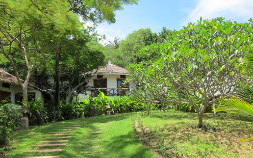 So wohnen Sie: Je nach Vorliebe wählen Sie zwischen den urigen Holzcottages Cottage Villa (42 qm) oder den großzügigeren Steinbungalows Whitesand Villa (52 qm). Alle Häuschen sind einzeln stehend und verteilen sich großzügig im Hotelgarten den Hang hinauf.