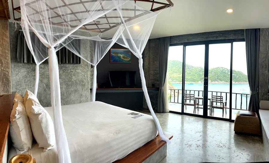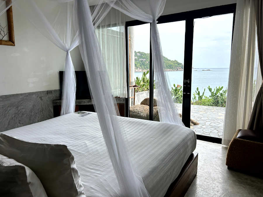 Wir konnten uns die Poonsuk Pool Villa (120 qm) ansehen. Vom Pool und der Dachterrasse aus schweift der Blick über die Insel Koh Tao und beide Seiten der Landzunge. Was für ein Panorama! Die Poonsuk Pool Villa hat 2 große Schlafzimmer mit Panorama-Meerblick sowie ein kleines Schlafzimmer (Einzelzimmer) und bietet Platz für insgesamt 5 Personen.