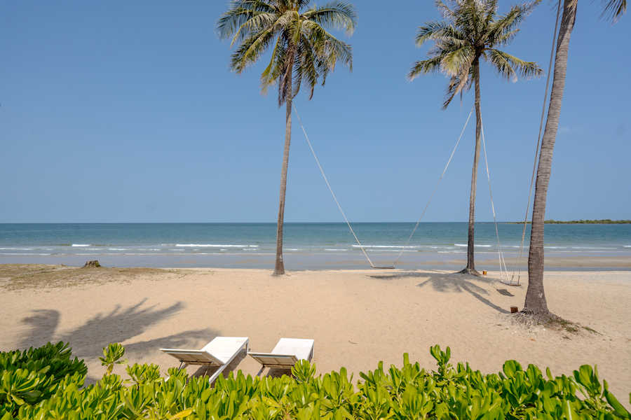 Ein wunderschöner Sandstrand zu beiden Seiten des Sirarun Resorts, soweit das Auge reicht. In der Ferne auf einem Hügel thront der märchenhafte Wat Thang Sai.