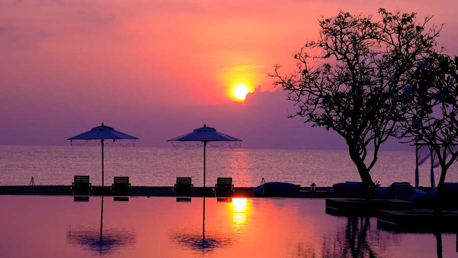 Mein Blick gleitet über die von Palmen gesäumte Poolanlage und den Garten zum Meer. Das Wasser glitzert im Licht der aufgehenden Sonne. Palmen wiegen sich in der leichten kühlenden Brise vom Meer her.
