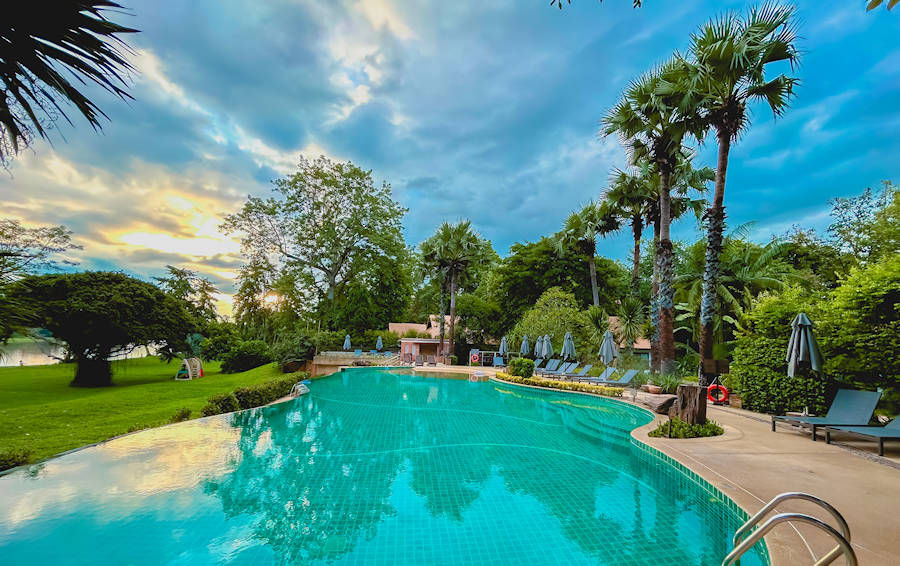 Das Resort fügt sich perfekt in die Natur ein, kleine Wasserläufe, Springbrunnen, Teiche mit Goldfischen und Lotusblumen, Brücken, mächtige Bäume und eine Vielzahl blühender Blumen und Sträucher schmücken den Garten. Der schön gestaltete Swimmingpool liegt nahe beim Fluss und beim Schwimmen hat man das Gefühl Fluss und Pool werden eins. Ebenso wurden beim Bau der Bungalows und Gebäude ganz geschickt Naturmaterialien eingebunden. So entstand ein warmer, harmonischer Gesamtkomplex, der an Eleganz und Komfort nichts zu wünschen übriglässt.