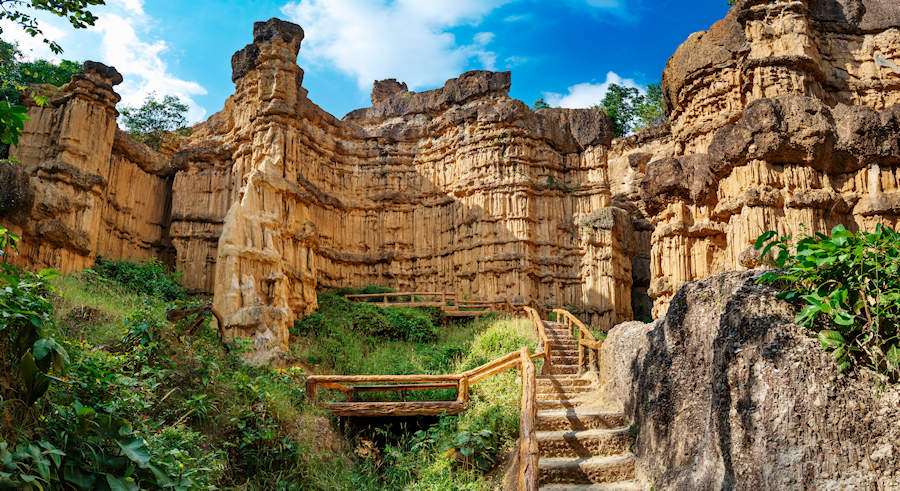 Morgens um 08 Uhr starten Sie zu dieser wunderschönen Tour in den unbekannten Westen Nordthailands. Sie folgen dem Fluss Ping durch das landschaftlich überaus reizvolle Ping-Tal und kommen zum Pha Chor Canyon. Auf seinem Weg hat sich der Fluss eine Schneise durch die Felsen gefressen. Die Thais nennen diese Gegend wegen ihrer dramatische Klippen und Erdsäulen auch Grand Canyon.