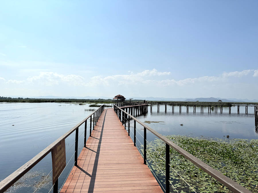 Sie unternehmen eine Fahrt mit dem Longtailboot durch diese einmalige Naturlandschaft. Ziel der Bootstour ist der im Herzen des Feuchtgebiets gelegene Bueng Bua Boardwalk, ein verstecktes Juwel, das Besuchern die einzigartige Gelegenheit bietet, das friedliche Feuchtgebietsökosystem des Parks zu erkunden. Dieser etwa 1,2 Kilometer lange Holzsteg schlängelt sich durch die Feuchtgebiete und bietet ein ruhiges und intensives Naturerlebnis. Von hier aus geht es dann per Boot auf einem anderen Weg wieder zurück zum Ausgangspunkt.