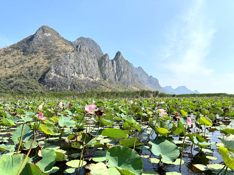Die intensivste Blütezeit der Lotusblumen ist hier von Anfang Januar bis Ende März, wobei die Lotusblumen in der Regel im Februar und März am schönsten sind. Während der Haupt-Blütezeit bedecken die Wasserblumen den See mit einem leuchtend rosa Farbtupfer, vor dem sich die spektakulären Kalksteinberge imposant erheben.