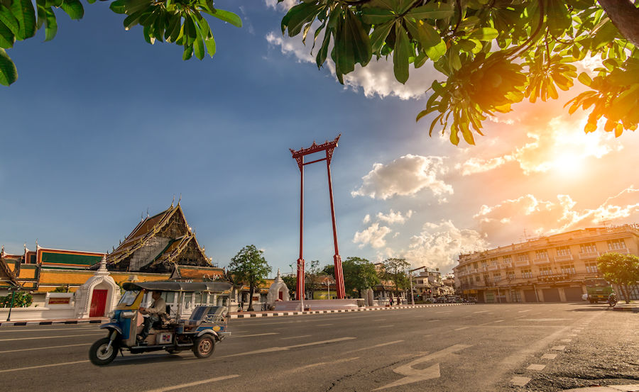 Wer das echte Bangkok erleben will, der sollte früh starten. Aber auch die Nachmittagstour hat Ihre Reize. Wir holen Sie also entweder um 08:00 Uhr morgens oder um 13:00 Uhr nachmittags in Ihrem Hotel ab. Dann geht es in die Altstadt. Wenn man im Bangkok vom alten Zentrum spricht, dann ist damit die Rattanakosin Insel zwischen Kanälen und Fluss gemeint. Hier liegt der wunderschöne Tempel Wat Suthat, ein königlicher Tempel ersten Grades, bei Touristen weniger bekannt aber dafür bei Thais recht beliebt, denn es ist der Tempel in dem man für materielles Glück bittet.
