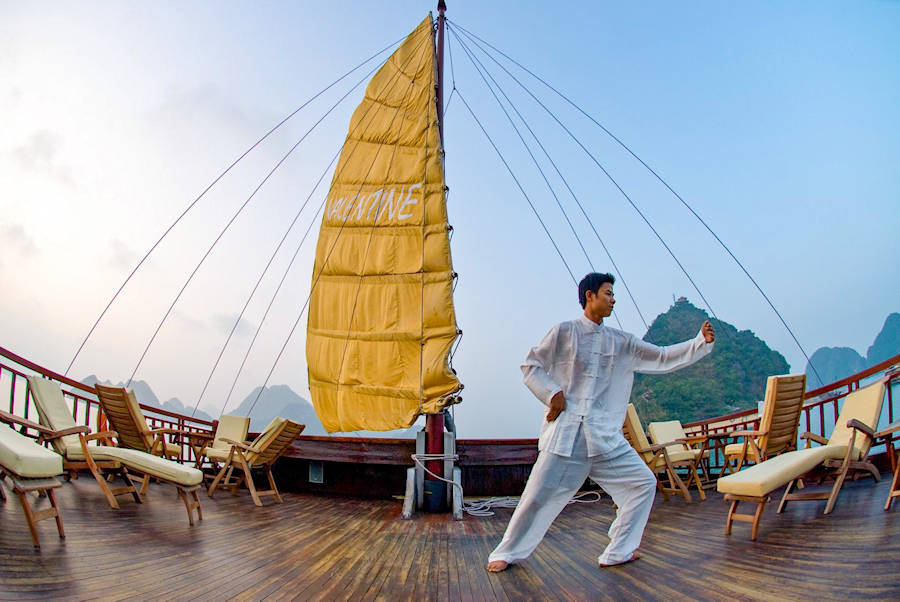 Wie wäre es, den Tag und den Sonnenaufgang mit einer morgendlichen Tai Chi-Übung auf dem Sonnendeck zu begrüßen? Genießen Sie dann das Frühstück und die letzten Blick auf die Bucht von Halong zu erhaschen, während Sie zurück zum Dock fahren. Gegen 12 Uhr checken Sie aus und es geht auf der Autobahn zum Flughafen von Hanoi (ca. 130 km).