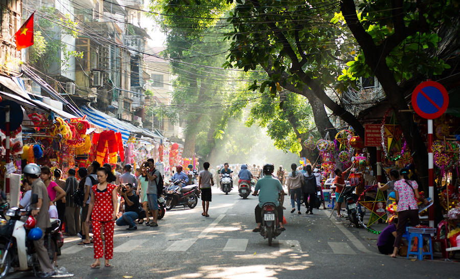 Zum Abschluss diesen spannenden Tages werden wir dann durch das sogenannte "Old Quarter", das alte Viertel der Stadt, spazieren. Wie in einem Bienenkorb geht es in den engen Gassen des alten Handelsviertel zu. Die Häuser sind oft mit Kletterpflanzen bewachsen und mit Vogelkäfigen behängt, die Trottoirs sind voller Straßenstände und Garküchen, in denen lecker duftende Suppen angeboten werden, und der restliche Platz dazwischen ist mit Fahrrädern und Mofas zugestellt oder von spielenden Kindern und tratschenden Nachbarn bevölkert. Wir stoppen an einem traditionellen Coffee Shop um eine Glas Bia Hoi, das lokale Bier, zu probieren.