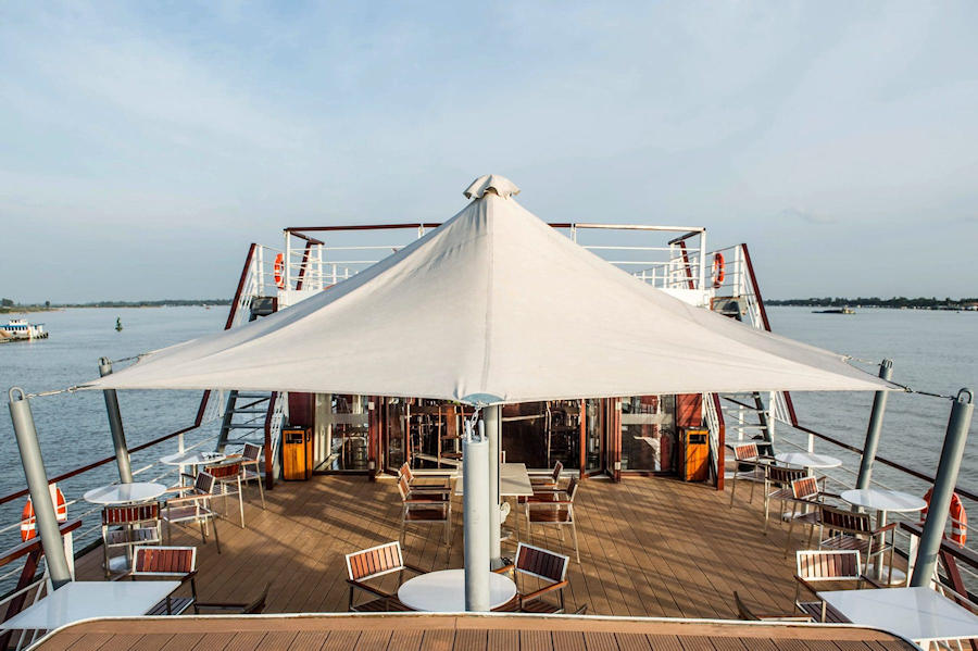 Außerdem gibt es ein Außen- und ein Sonnendeck mit Liegestühlen zum Ausruhen. Auch von hier haben Sie eine wundervolle Aussicht. Lassen Sie sich von unserem Personal auf Ihrer einzigartigen Flusskreuzfahrt verwöhnen.