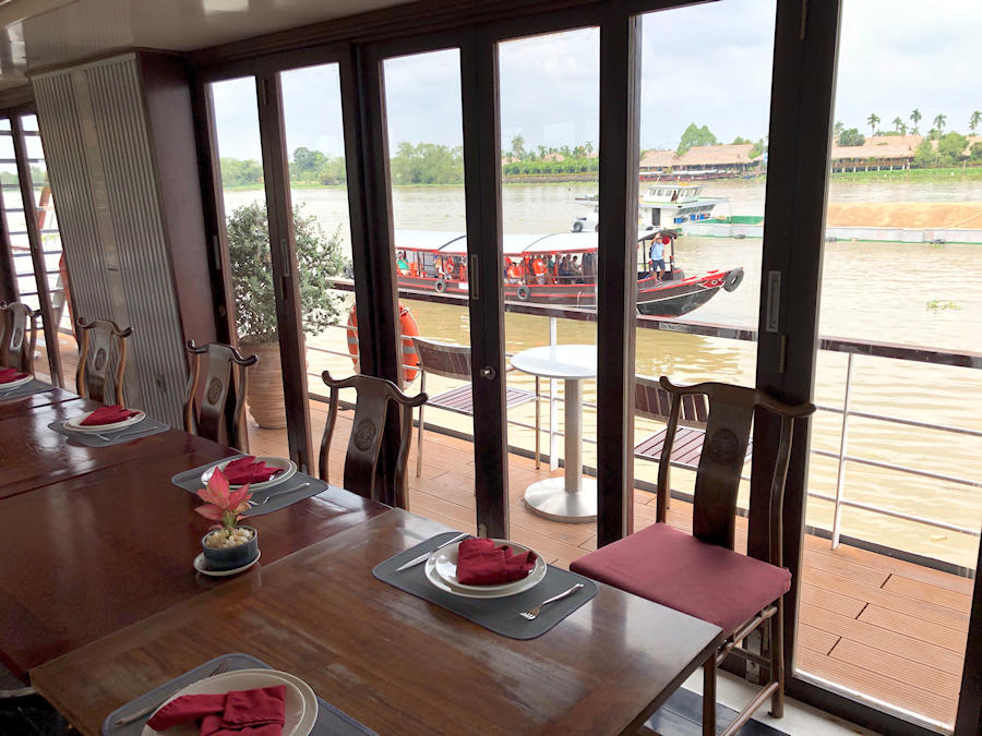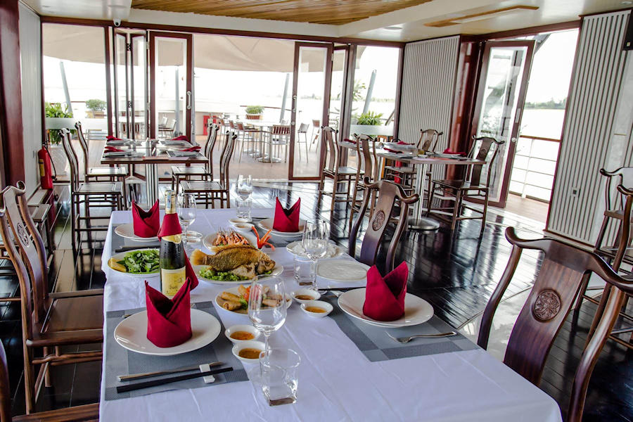 Auf dem Unterdeck befindet sich ein großes Restaurant in dem Sie die Köstlichkeiten der vietnamesischen Küche probieren können. Im stilvollen Barbereich lässt sich ein "Sundowner" ganz wunderbar genießen. Eine geschmackvoll eingerichtete Panorama Lounge bietet Ihnen die Möglichkeit sich den eindrucksvollen Rundblick und das Leben auf dem Fluss auch aus angenehmer Kühle anzuschauen.