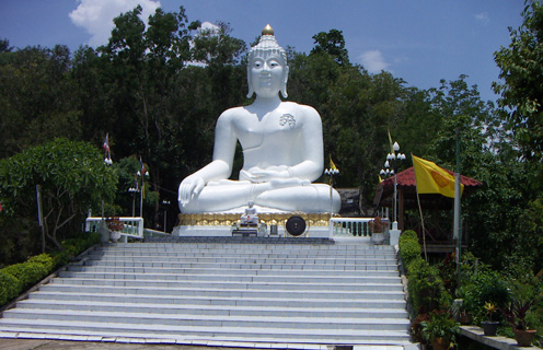 Thaton wird von mehreren Buddhastatuen überragt, von weiten glänzt der goldene Buddha hoch oben auf dem Berg, besonders berühmt sind aber die beiden weißen Buddhas.