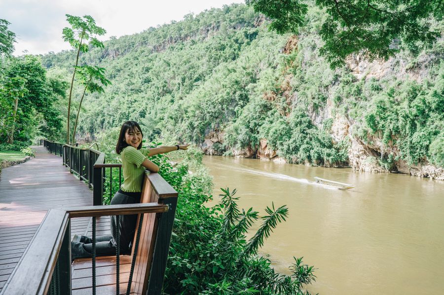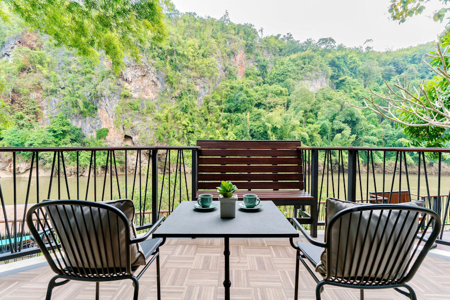 Das River Kwai Resotel liegt etwas oberhalb des Kwai Noi Flusses. Das Resort erreicht man ganz bequem per Wassertaxi des Resorts vom Hotelpier etwas stromaufwärts von der anderen Seite des Flusses. Die Chalets und Bungalow verteilen sich über den weitläufigen tropischen Garten. Man kann schöne Ausblicke auf den Fluss genießen und zu Fuß zu Lava-Höhle wandern. Es gibt einen Kräutergarten und es werden abendliche Kulturveranstaltungen im Mon-Village angeboten. Beim Fluss gibt es eine Badeplattform mit Liegestühlen und Sonnenschirmen.