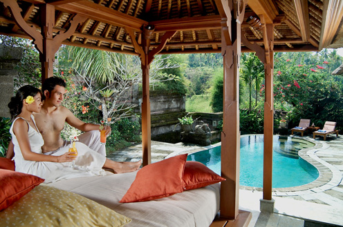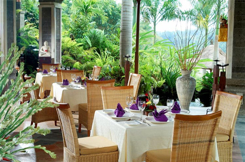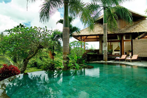 Die Bausubstanz hat sich hier nach der Natur gerichtet und nicht umgekehrt. So wurden Palmen und Bäume nicht einfach gefällt, sondern in die Architektur mit eingebunden. So kommt es auch, dass jede Villa ein bisschen anders ist, ihren eigenen Charakter hat. Die gegenüberliegende Seite des Flusstals gehört ebenfalls zum Hotelgrundstück und so ist sichergestellt, dass dieser wunderbare Ausblick auch nicht verbaut werden kann. Das Resort liegt 5 km von Ubud Zentrum entfernt.