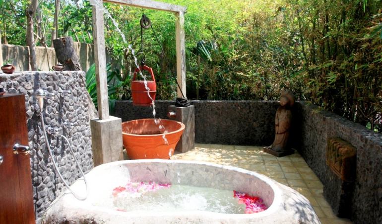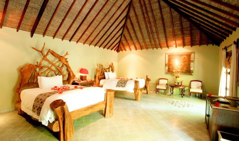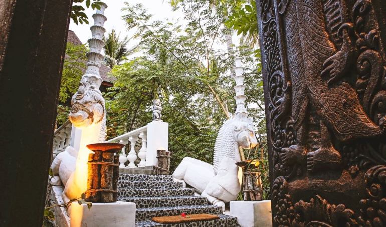 Mit Antiquitäten und Kunstwerken ausgestattet, erzeugen die Gebäude von innen wie von außen eine leicht mystische Wohlfühllandschaft. Die sehr geräumigen Zimmer sind wunderschön eingerichtet mit verschiedenen Farben, hauptsächlich dunklen Hölzern, Bambus und Batik-Stoffen. Alle verfügen über eine private Terrasse sowie Innen- und Außenbad mit einer großen kupfernen Badewanne und breiter Regendusche.