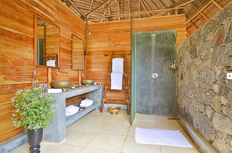 So wohnen Sie: 9 traditionelle "offene“ Bungalows bestechen durch perfekte Ausstattung und sind mit viel Liebe und Naturmaterialien gestaltet. Fliegengitter zwischen Dach und Schlafraum und offenem Badezimmer mit Regendusche. Die Himmelbetten sind mit Moskitonetz ausgestattet. Der Eingangsbereich bietet eine Lounge-Ecke mit Blick auf die Terrasse – die meisten Bungalows haben einen atemberaubenden Blick ins Grüne und auf die Berge. Im offenen Badezimmer befindet sich die Toilette, eine Regenwald-Dusche und zwei Waschbecken mit schönem Elefanten-Bedienelement. Wohlfühl-Ambiente bis ins kleinste Detail.