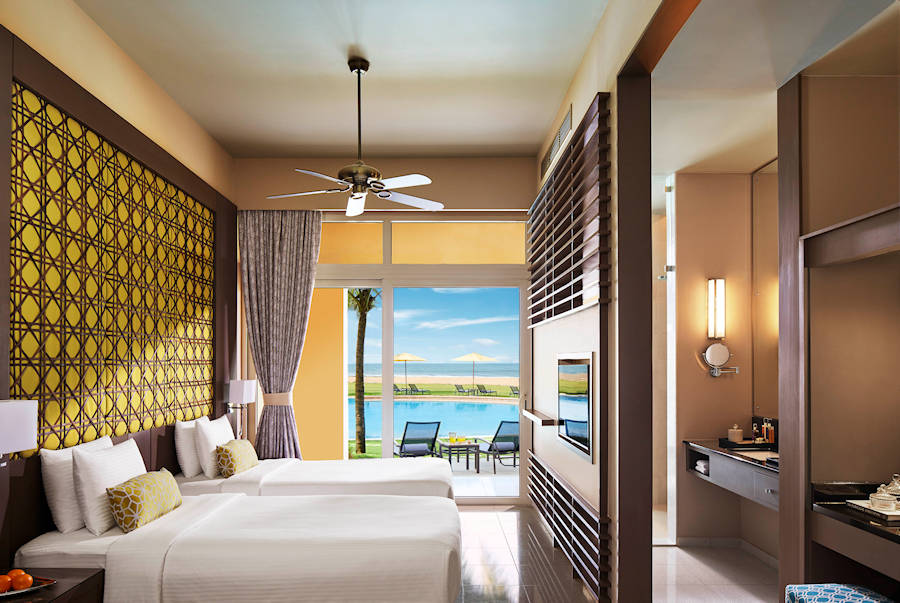 Wohnen und Wohlfühlen: Die 138 klimatisierten Zimmer verteilen sich auf mehrere Gebäude. Jedes Zimmer bietet Blick Richtung Indischen Ozean und ist geräumig mit 430 sq.ft. Wohnfläche. Im eigenen Badezimmer mit Regendusche liegen ein Haartrockner und Bademäntel bereit. Ebenfalls sind die Zimmer mit einer Tee- und Kaffezubereitungsmöglichkeit und einem Bügeleisen/-brett ausgestattet.