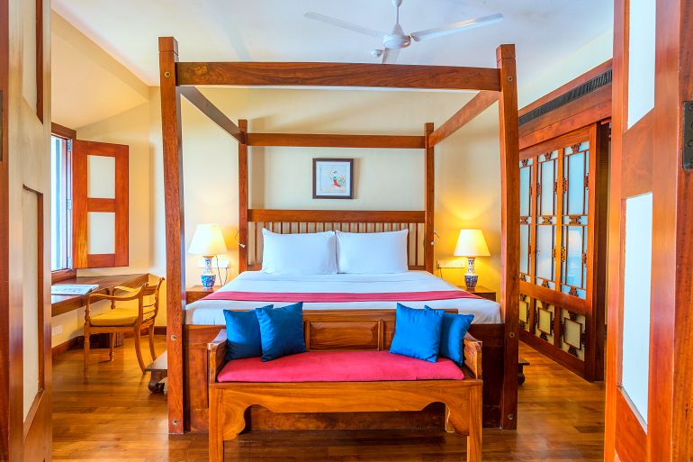 So wohnen Sie: Die 60 Deluxe Zimmer (ca. 30qm) sind geräumig und geschmackvoll eingerichtet, mit eleganten Holzmöbeln ausgestattet und verfügen über ein Bad mit Badewanne, WC und separater Dusche. Sie haben Balkon oder Terrasse mit Meerblick. Die geräumigeren Suiten (ca. 65qm) sind im marokkanischen, chinesischen oder holländischen Stil eingerichtet und haben zusätzlich eine separate Gästetoilette, einen separaten Wohnraum mit Küchenzeile und einen größeren Balkon.