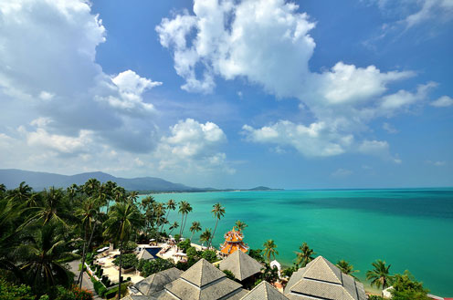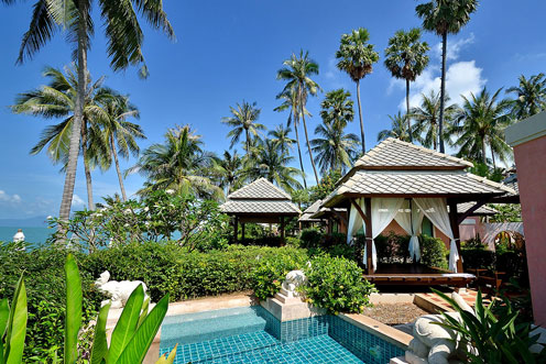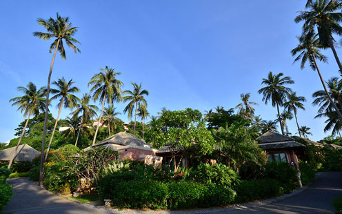Kokospalmen soweit das Auge reicht. In dieser herrlichen Landschaftskulisse liegt dieses elegante Urlaubsdomizil am Maenam Beach. Das geschmackvolle Design im modernen thailändischen Stil spiegelt die Handschrift der Besitzerfamilie wider und gibt der Anlage ein elegantes und zugleich wohnliches Ambiente. Blickfang ist die von Wasser umflossene offene Lobby. Ihr schließen sich zur Hügelseite das Hotelgebäude mit den Zimmertypen Deluxe Balcony, Sunset Jacuzzi und Sunset Suite an. Auf der anderen Seite liegen die Villen in einem schönen Palmengarten, der an den Strand grenzt. Ansprechend wirkt der schön gestaltete Poolbereich mit seinen integrierten Jacuzzi-Liegen und einem separaten Kinderpool. Leicht kann man das Ortszentrum von Menam erreichen und zum Chaweng Beach wird ein Shuttle angeboten.