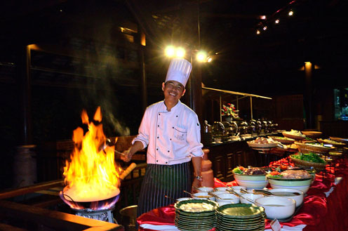 Kulinarisches: Einen wunderschönen Ausblick über die palmengesäumte Bucht des Maenam Strandes hat man vom "The Bre-Eze Restaurant". Das offen, im Stil eines Thai Pavillon gestaltete Ensemble offeriert beste Thaiküche und mediterrane Spezialitäten, unter anderem Pizza und diverse Nudelgerichte. Hier wird auch das Frühstücksbuffet serviert. Wahlweise kann man das Frühstück aber auch auf seinem privaten Balkon oder in der Villa genießen. Für Erfrischungen, Snacks und coole Drinks sorgt "The Bre-Eze Bar" am Strand und die Poolbar. Ein Zimmerservice wird ebenfalls angeboten.