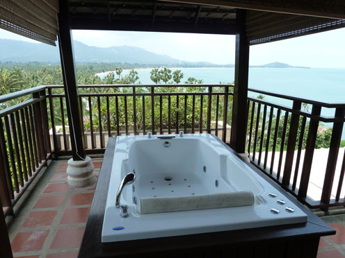 Besonders faszinierend ist der Ausblick von den zehn Sunset Suiten (62 qm), welche in der obersten Etage liegen und ebenfalls einen Jacuzzi-Pavillon auf der Terrasse haben.
