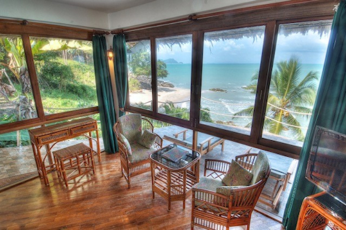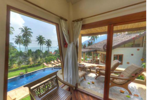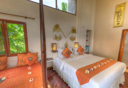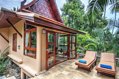 Die Bungalows im modernen Thaistil sind mit 26 qm Raumgröße sehr großzügig bemessen ,einem Bad von acht qm und einer schönen, überdachten Terrasse. Die meisten Bungalows blicken aufs Meer. Sie können wählen zwischen 2 Einzelbetten oder einem King Size Bett, außerdem hat jeder Bungalow noch ein fest eingebautes Bett für ein bis zwei weitere Personen, das sonst als gemütliche Liege genutzt wird. Man hat besonders viel Liebe in die Innenausstattung investiert und für jeden Bungalow unterschiedliche Dekorationen und Accessoires gewählt.