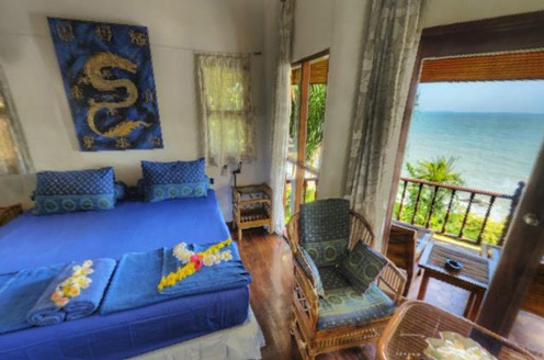 Der Luxusbungalow No.4 liegt direkt über dem Meer, ist lebevoll möbliert und hat einen schönen Meerblick .Er enthält ein geräumiges Wohn- Schlafzimmer und eine Schlafempore mit zwei zusätzlichen Betten für 2 Kinder oder Erwachsene. Im großzügigen Bad finden sie 2 Waschbecken und eine große runde Dusche mit Glaskuppel , durch die sie die Palmen im Garten sehen.
