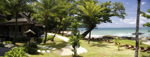 Mächtige Urwaldriesen breiten ihre weiten Arme aus, sorgen für Sonnenschutz und ein angenehmes Klima. Die Nähe zum Khao Lak Lamru Nationalpark ist hier zu spüren, denn gleich hinterhalb des Resorts beginnt der Regenwald. Türkisblau schimmert das Meer, goldgelb der Sand, herrlich der Kontrast. 400 Meter taumhafter Strand gehören zum Moracea by Khao Lak Resort, einige mächtige, glatt geschliffene Granitfelsen lockern das Bild auf.