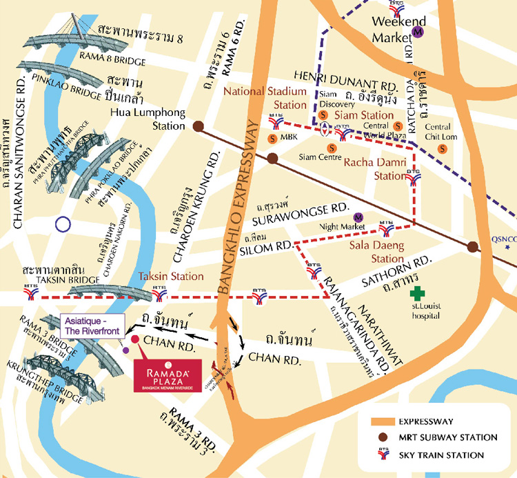 Das schöne und gut geführte Komforthotel Ramada Plaza Menam Riverside liegt direkt am Ufer des Chao Praya River. Das Hotel liegt etwas zurückgesetzt an der berühmten Charoen Krong Road mit ihren vielen alten Stadthäusern, netten kleinen Geschäften, Essensständen und Restaurants. Das ist echter Bangkok-Flair. Der Flughafen ist über den neuen Expressway bequem und schnell erreichbar. Der zur Zeit berühmteste Nachtmarkt Asiatique ist ebenfalls in Laufweite (siehe Insider-Tipps). Die großen Kaufhäuser rund um Siam sowie die Entertainment-Straßen der Silom Road sind ebenfalls leicht und schnell zu erreichen, einfach per Boot-Shuttle-Boot zum Saphan Taksin Pier und dann per Sky-Train nach Siam oder Sala Daeng fahren. .