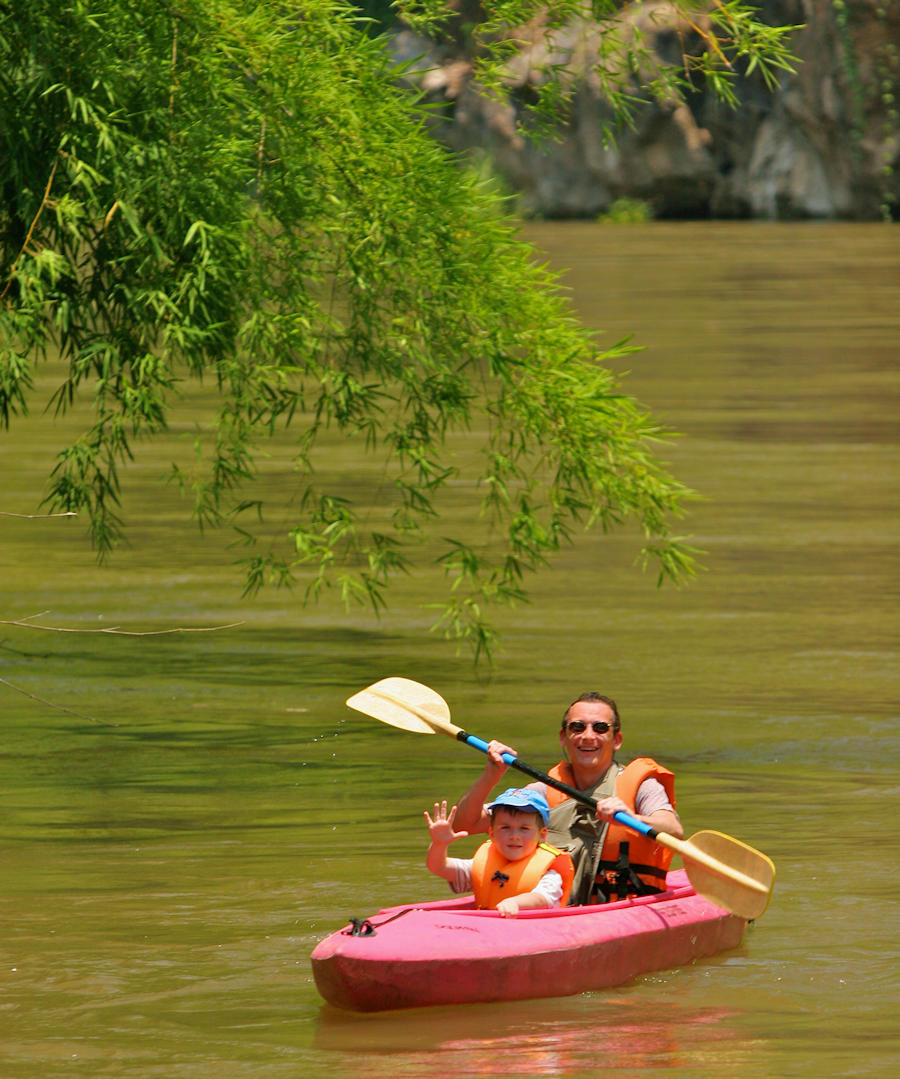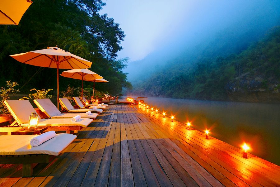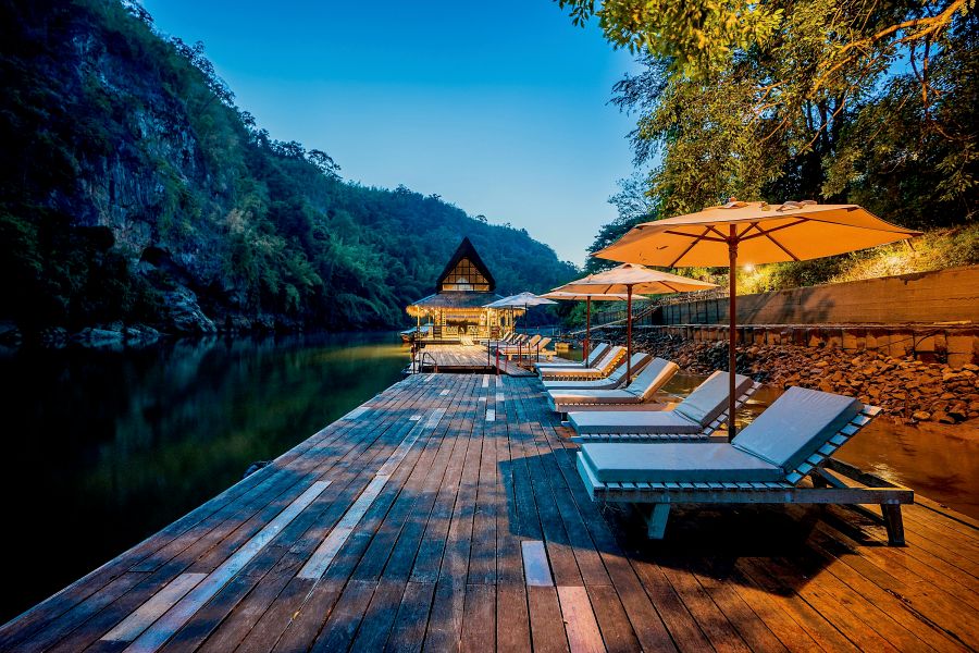 Das River Kwai Resotel liegt etwas oberhalb des Kwai Noi Flusses. Das Öko-Resort erreicht man ganz bequem per Wassertaxi des Resorts vom Hotelpier etwas stromaufwärts von der anderen Seite des Flusses. Die Chalets und Bungalow verteilen sich über den weitläufigen tropischen Garten. Man kann schöne Ausblicke auf den Fluss genießen und zu Fuß zu Lava-Höhle wandern. Es gibt einen Kräutergarten und es werden abendliche Kulturveranstaltungen angeboten.