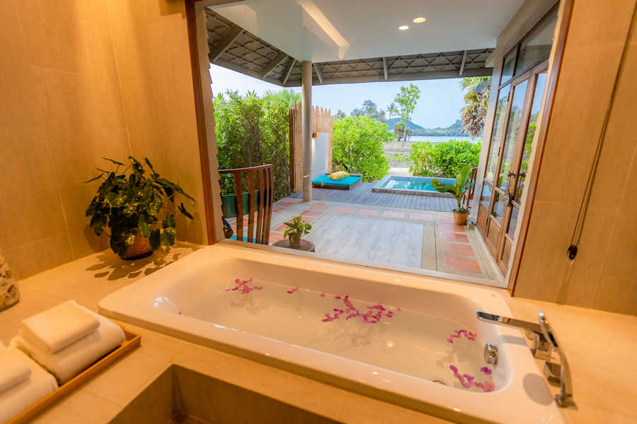 Alle Villen sind komfortabel und ansprechend eingerichtet, haben einen separaten Wohn- und Schlafbereich und ein großes Badezimmer sowie eine überdachte Terrasse.