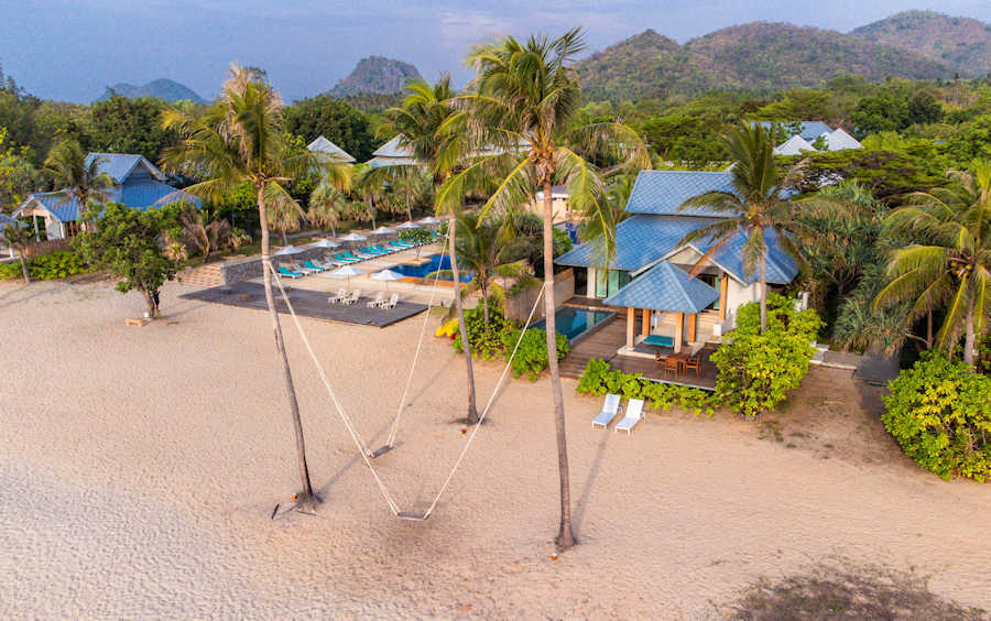 Ein wunderschöner Sandstrand zu beiden Seiten des Sirarun Resorts, soweit das Auge reicht. In der Ferne auf einem Hügel thront der märchenhafte Wat Thang Sai.