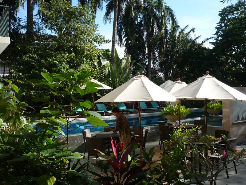 Sie werden nicht glauben können, dass Sie in Bangkok sind, noch dazu mitten in der Stadt. Alte Bäume, blühende Franschipani, die Lage direkt beim Wasser eines sauberen Klongs, der hübsch angelegte Garten mit einer langen Sitzbank, der attraktive Swimmingpool, der beeindruckende Lobby- und Restaurantbereich in der alten Villa mit seinen Bildern, dem historischen Flair und dem eleganten Touch.