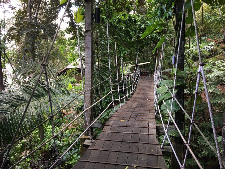 Was man hier alles machen kann: Hier sollte man auf jeden Fall länger bleiben als nur eine Nacht. Denn es gibt mehr als nur Strand und Schnorcheln. Man kann täglich einen geführten Baumwipfel-Spaziergang unternehmen. Es gibt es sehr schön inmitten des Dschungels gelegenes Spa.