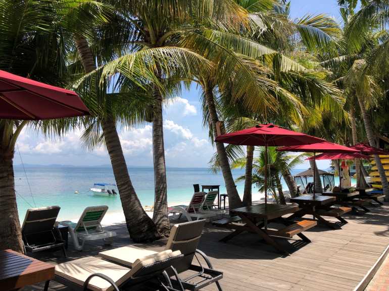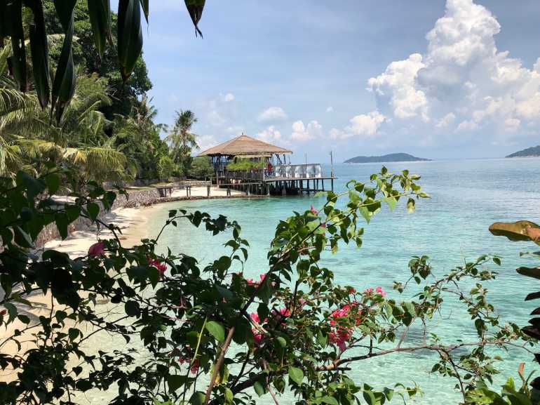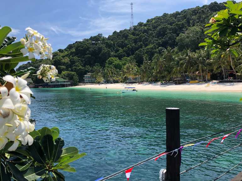 Hier liegt das Rawa Island Resort. Palmen, Blumen, ein tropischer Garten und dann dieser Strand. Wow!